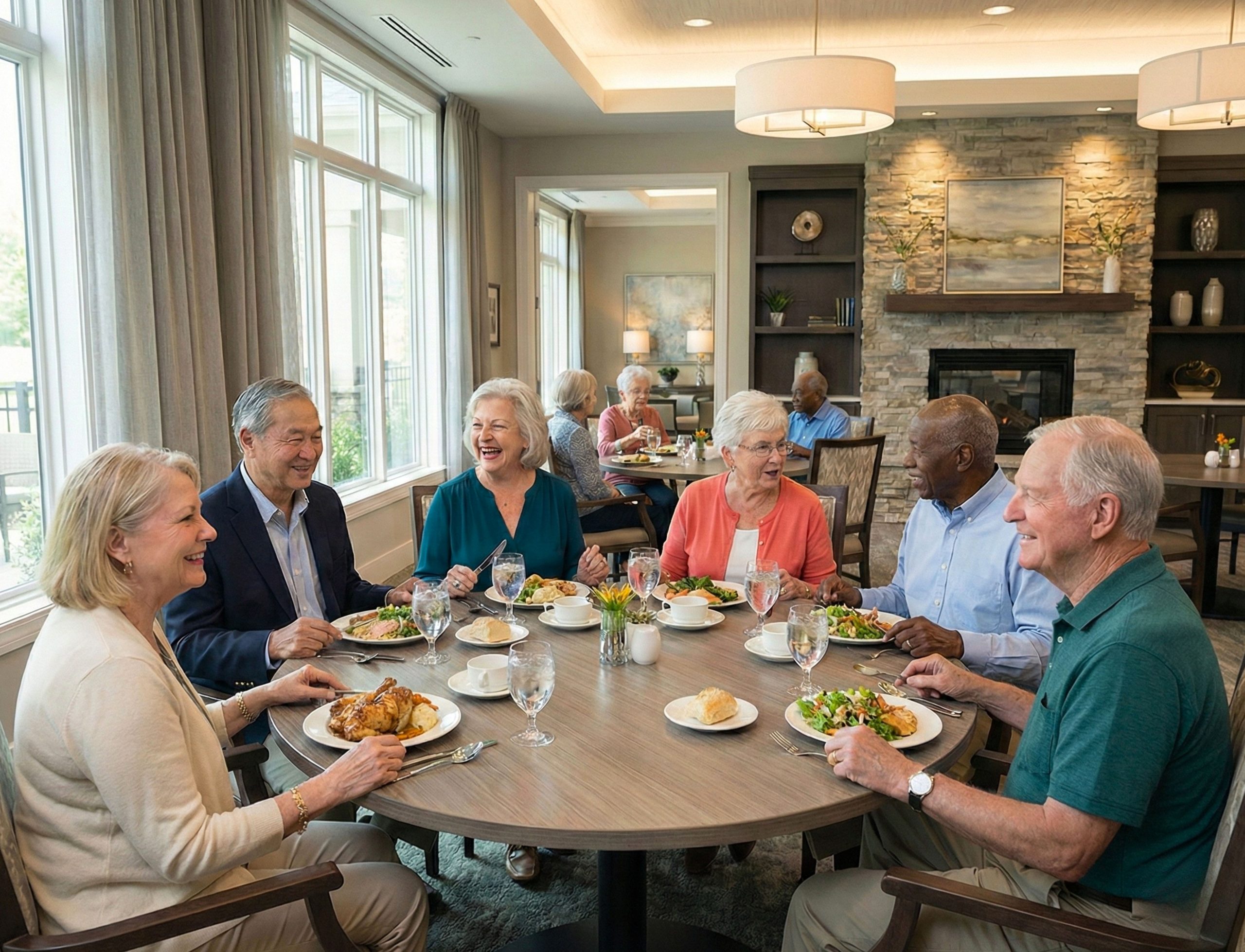 Flexible meal plans and options provide variety; cafes and dining rooms make shared meals easy, while amenities like fitness rooms, pools and salons enrich daily life.